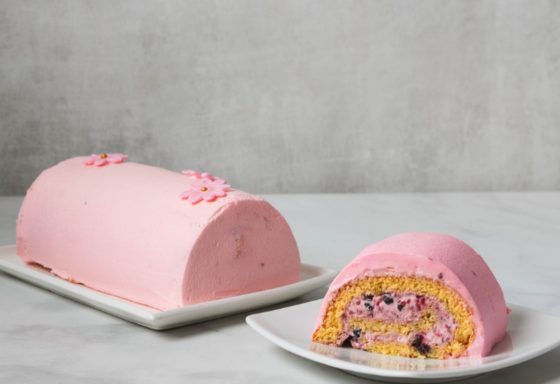 Postre tipo rollo elaborado con bizcochuelo suave, relleno de frutos rojos y crema de leche, con cobertura de crema de leche en tono rosado.